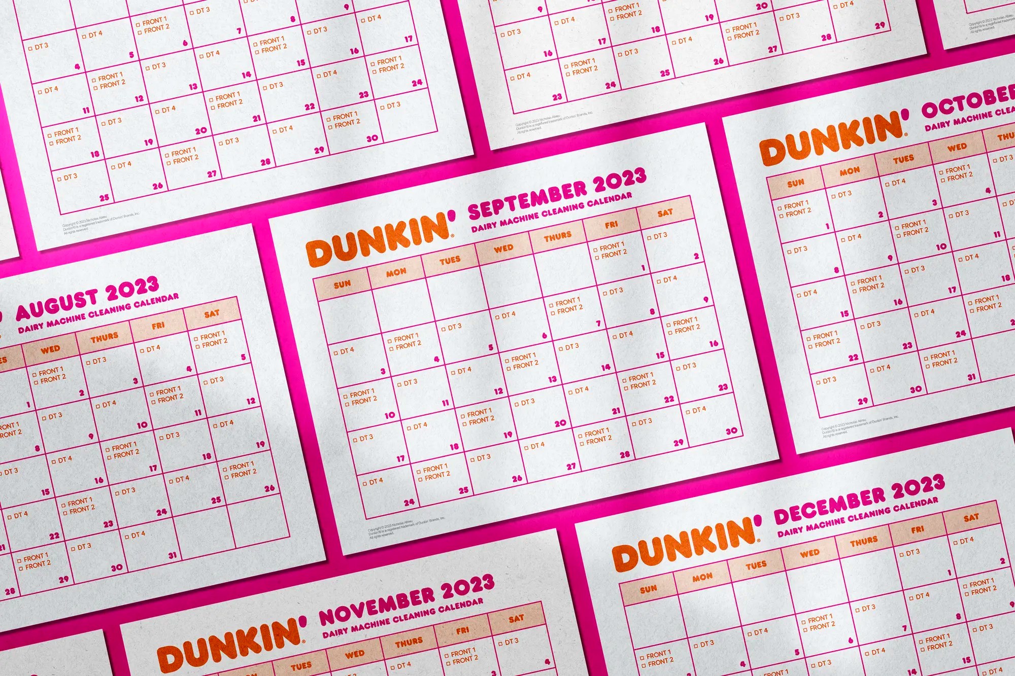 Cleaning calendar created for Dunkin', featuring a full twelve-month collection customized for store dairy machines and cleaning cycles.