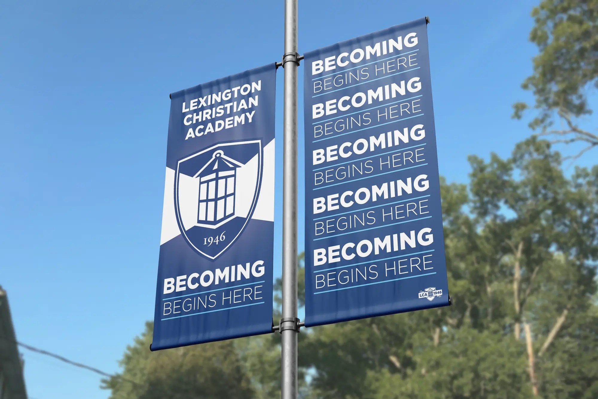 Pole banner designs created for Lexington Christian Academy, featuring the school's logo, wordmark, and slogan. Banners highlight school identity and support for athletic teams.