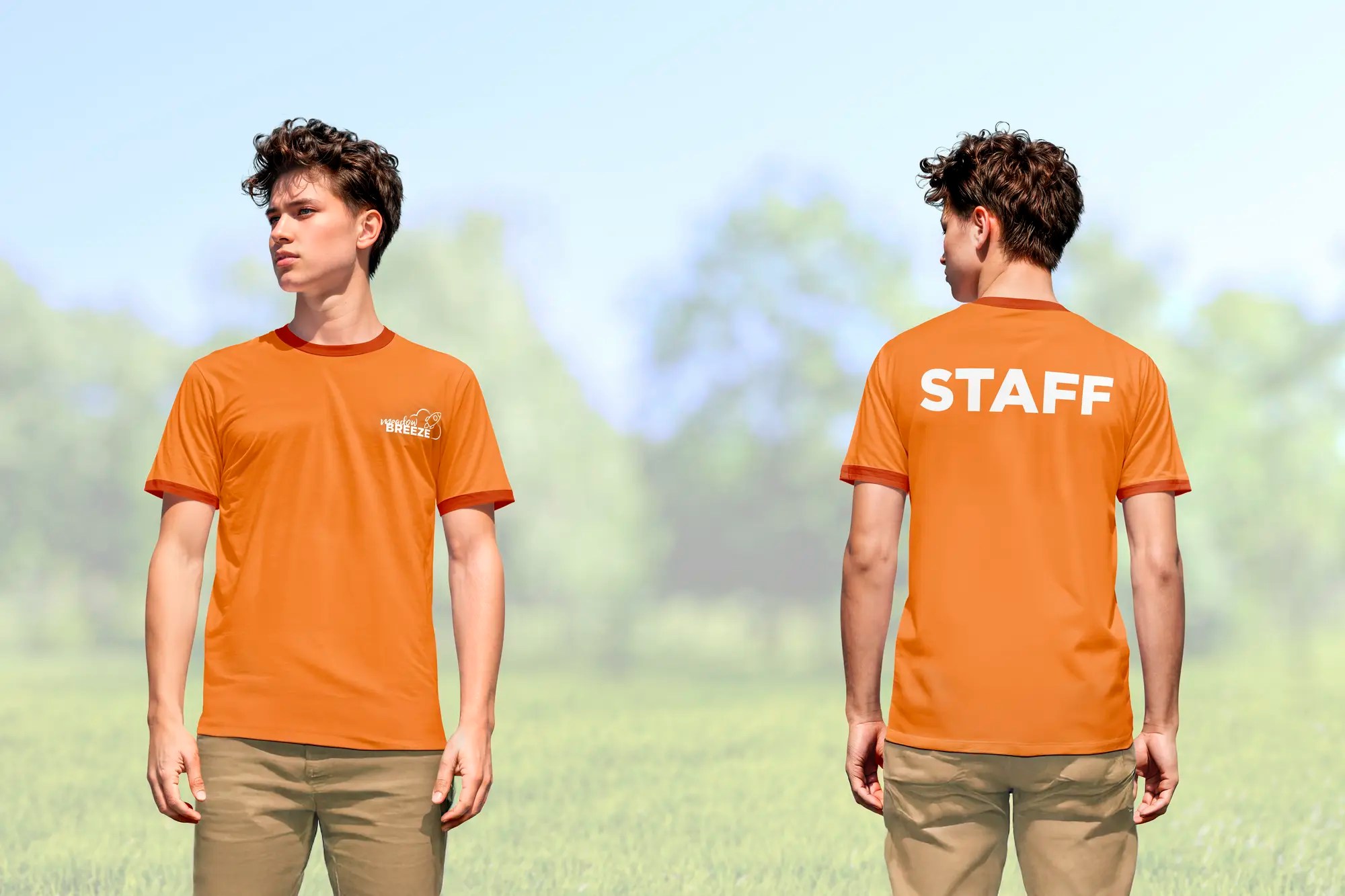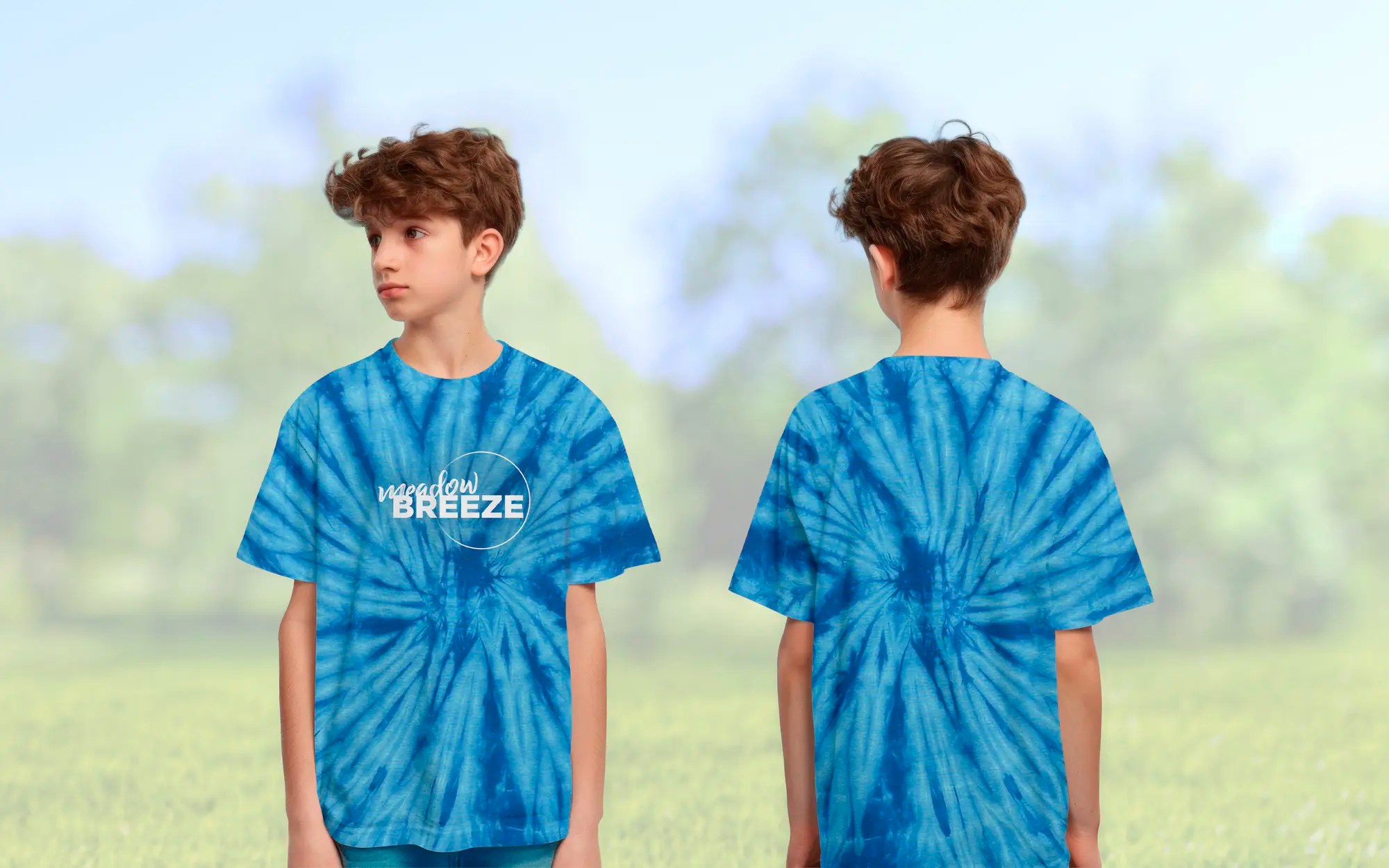 Staff and camper shirt designs created for Meadow Breeze Day Camp. Staff shirts feature the full roster of camper groups with detailed neck and sleeve cuffs, while camper shirts showcase playful tie-dye patterns.