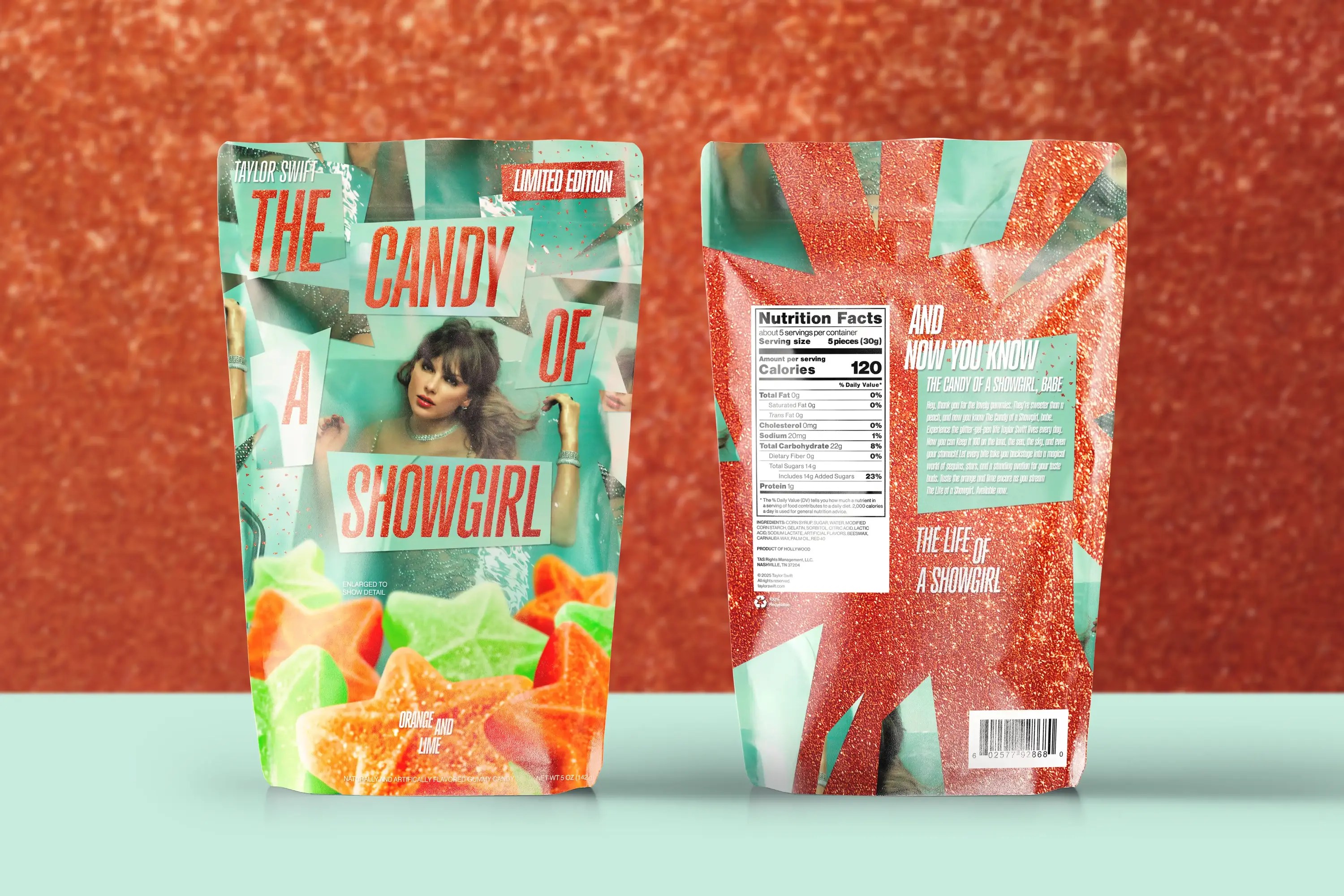 Candy packaging design inspired by The Life of a Showgirl branding.